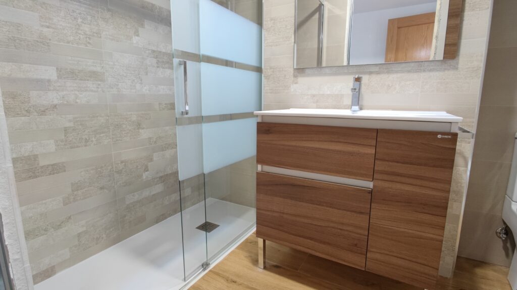 Para finalizar se han equipado de sanitarios, grifería, mamparas de ducha, iluminación y accesorios los dos baños, de mismo modo se ha realizado todo el equipamiento de la cocina, como son los muebles, encimera, auxiliares etc.